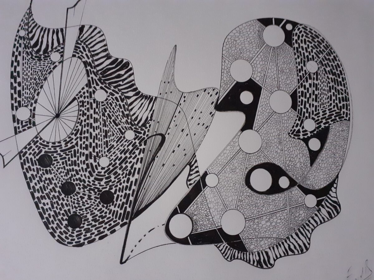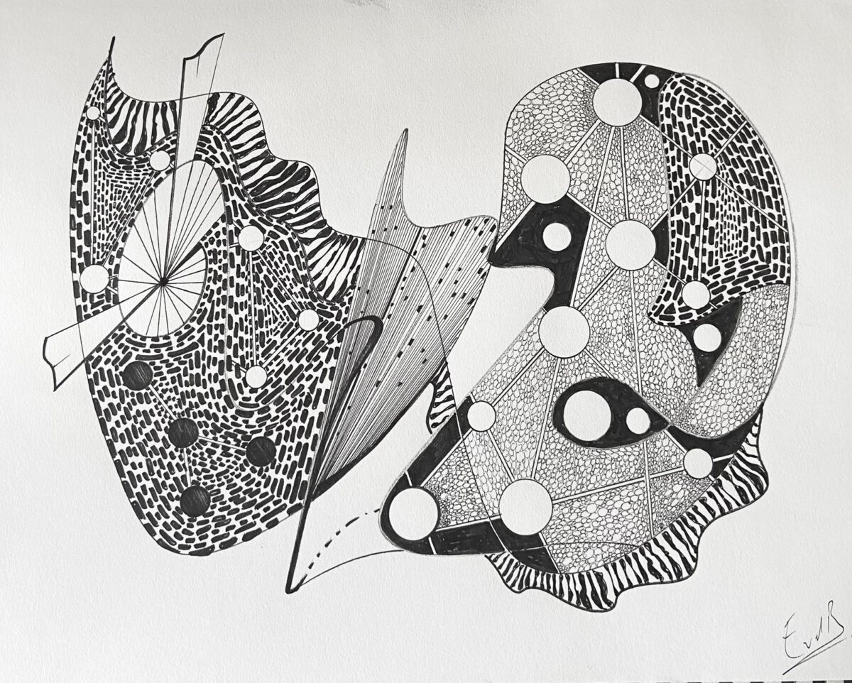 Geïnspireerd door grootheden als Malevich, Mondriaan, Miró en Kandinsky, beweegt hij zich in het spanningsveld tussen het organische en het wiskundige. Zijn handschrift is persoonlijk en verfijnd: met fijne stiften, kleurpotloden en grafiet bouwt hij werelden die doen denken aan patronen in de natuur, botsende sterren, stads plattegronden of ritmische mozaieken.